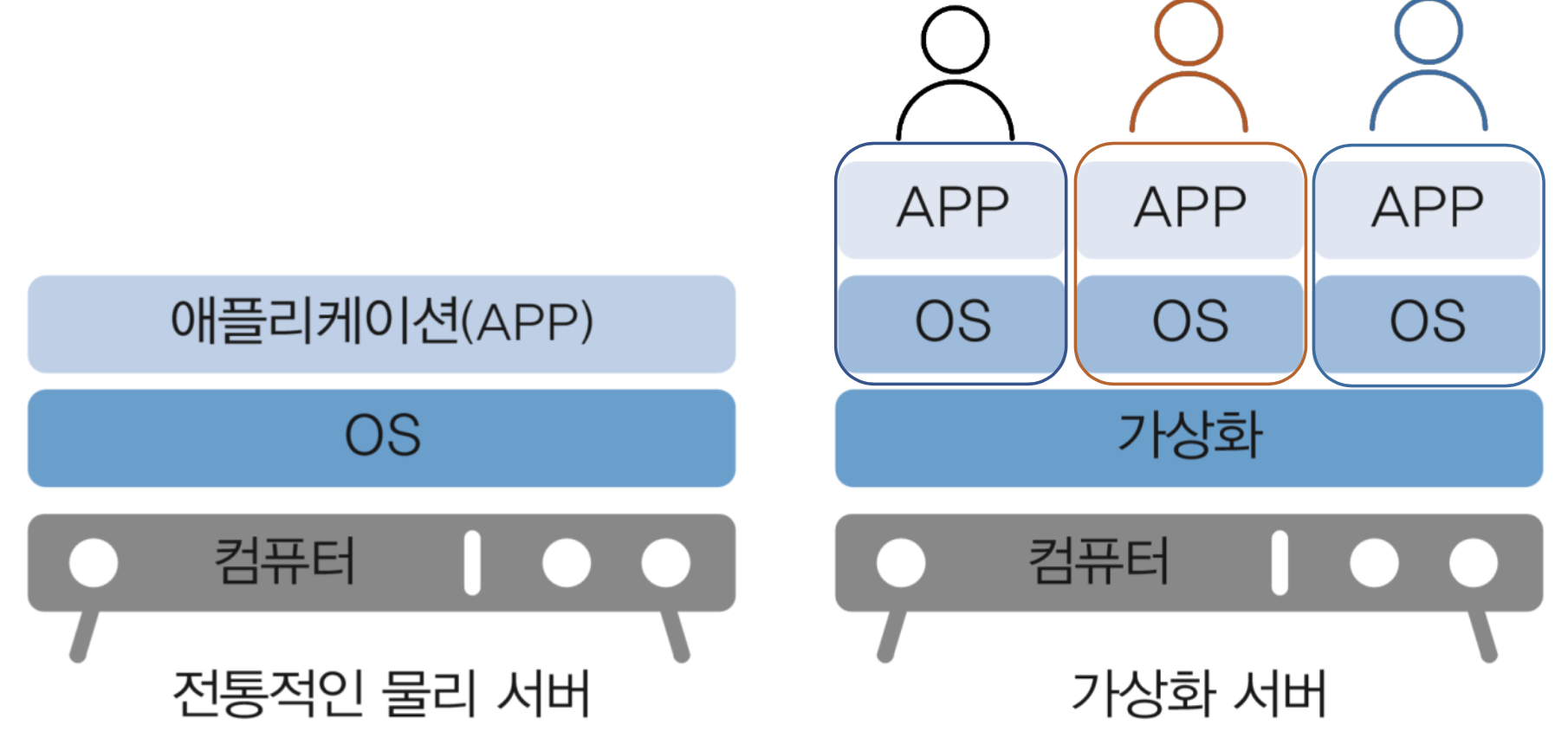 - 물리적 컴퓨터 환경상에 가상 인스턴스(또는 가상머신를 만드는데 사용되는 기술