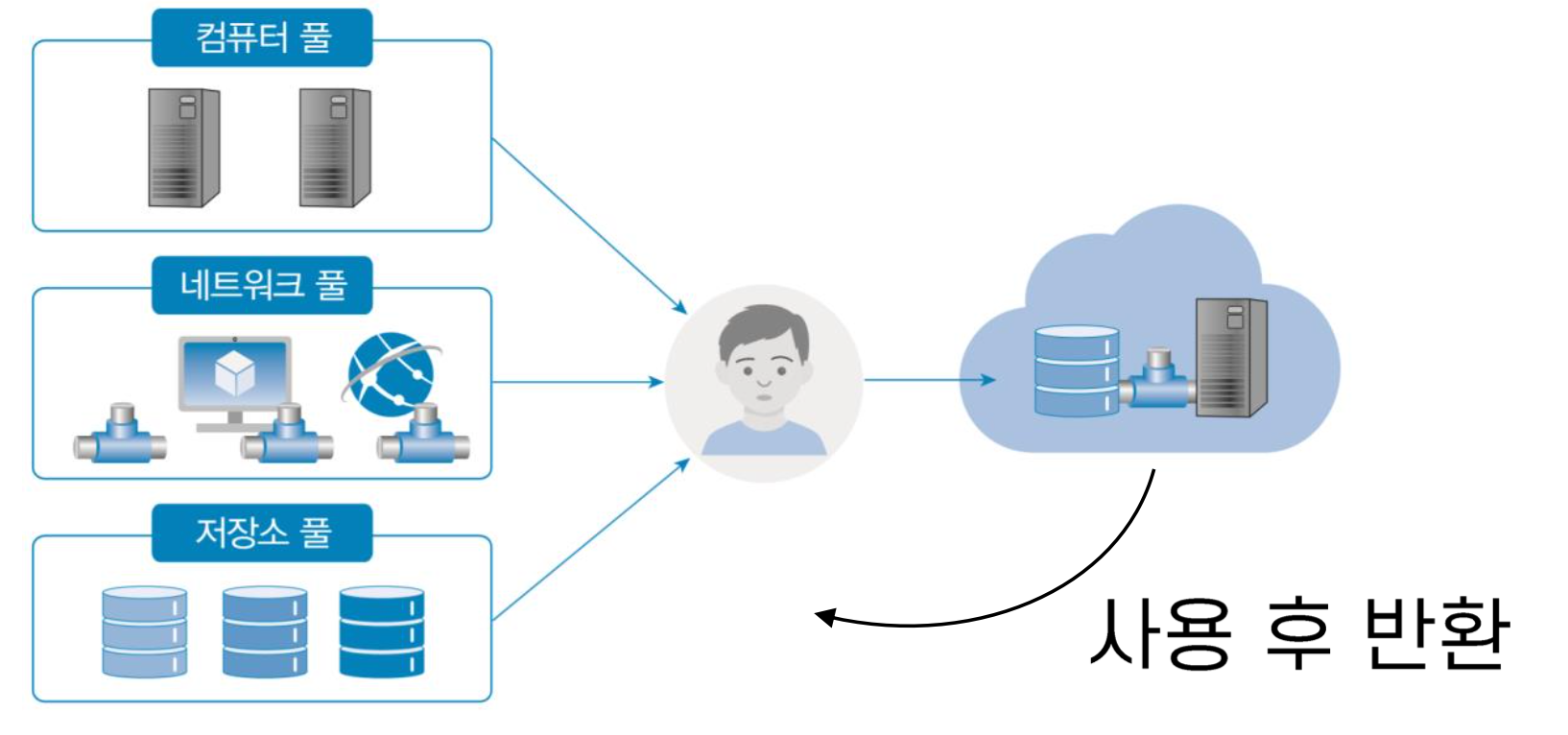 | 주문형 셀프서비스 | - 이용자는 서비스 제공자와 직접적인 상호작용을 거치지 않고, 자율적으로 자신이 원하는 클라우드 서비스를 이용 가능 |