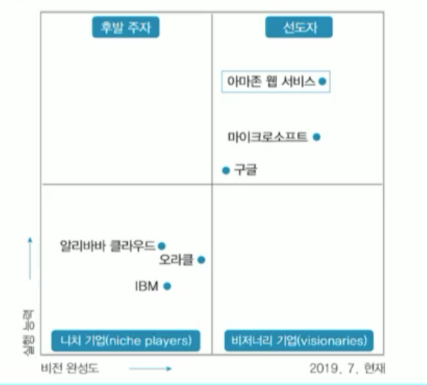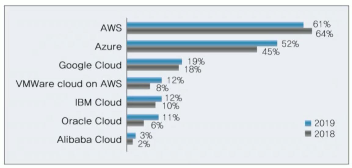 - 아마존 사가 최초로 성공하여 10년이상 클라우드 시장을 선도하고 있으며, 후발 주자로 마이크로소프트, 알리바바, 구글이 뒤를 잇고 있다